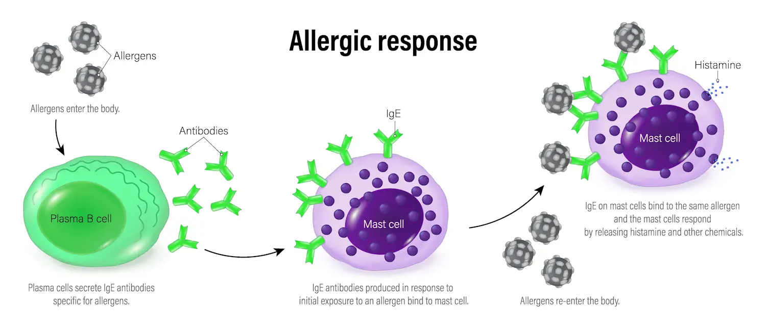 Bei Erstkontakt „lernt“ das Immunsystem den Stoff kennen und bildet spezielle Antikörper (IgE) dagegen. Kommt es später erneut zum Kontakt, erkennt der Körper das Allergen wieder und reagiert mit einer überschießenden Immunantwort: Es werden Botenstoffe wie Histamin ausgeschüttet, die zu den typischen Symptomen führen – Juckreiz, Schwellung, Rötung, Schleimhautreaktionen oder Atembeschwerden.